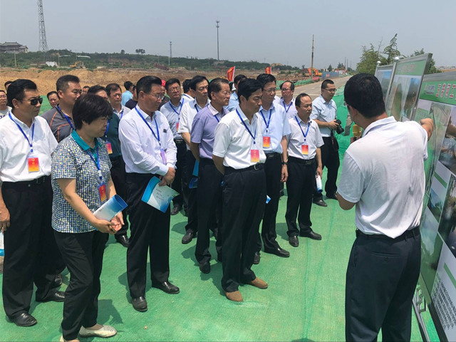 7月6日,济南市章丘区人大常委会党组书记、主任王继民,党组副书记、副主任程秋霞,党组成员、副主任李兴贵一行察看集团承建的玉带河及绸带公园工程总承包(EPC)工程建设情况。